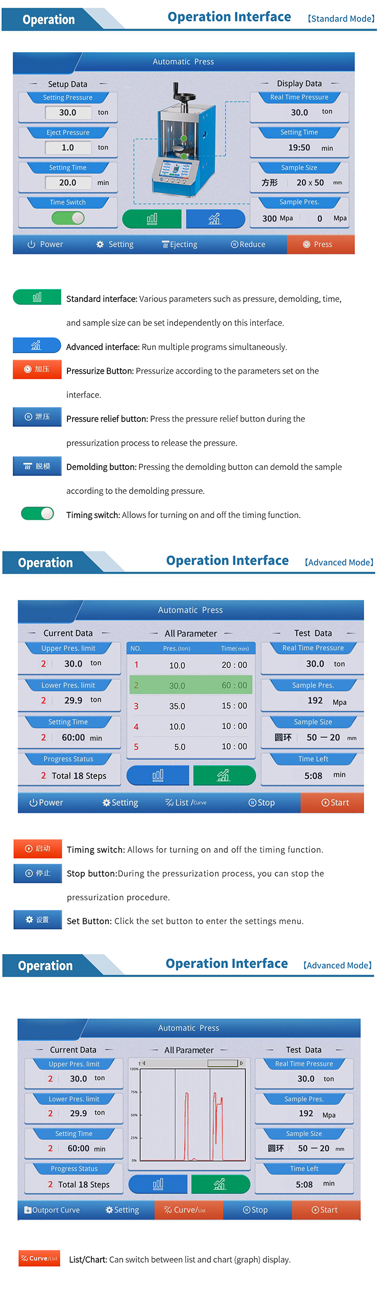 Can display each operation curve graph and support U disk download Excel file |