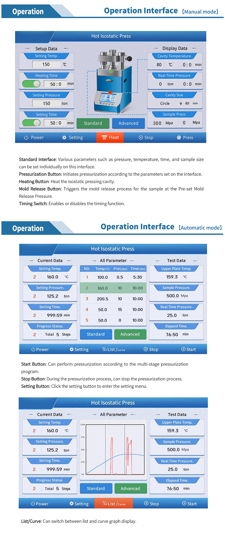20-stage programmed pressurization with pressure profile display. |